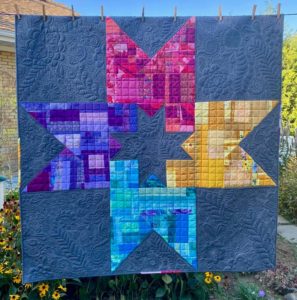 The quilt is designed as a one-block quilt to keep it simple/modern and use up lots of fabric in the process. You will also have blank spaces to feature some free motion or ruler quilting. Robin will also send you dimensions for crumb piecing so you can be ready with your “crumb sheets at the class”. Quilt Sizes- 18 x 18”, 27″ x 27″ or 55″ x 55″. Your choice.